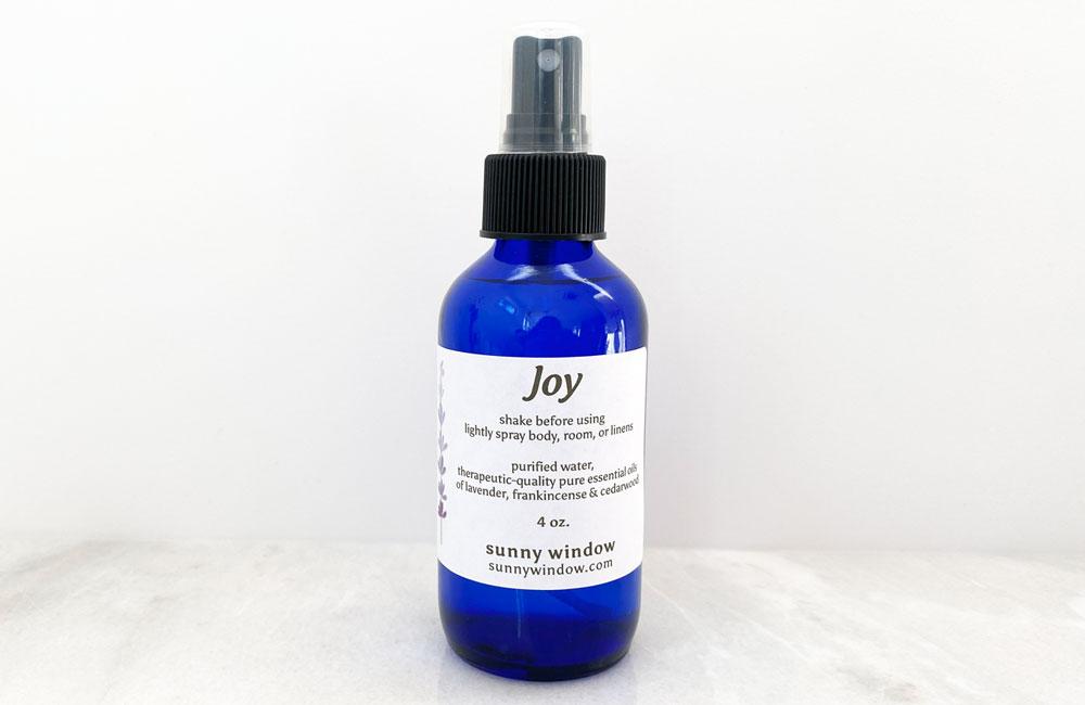 Joy is a blend of essential oils of lavender, frankincense and cedarwood that is calming, grounding and soothing all at once. Handmade by Sunny Window with the highest quality essential oils and purified water. Great for body, rooms and linens. 4 oz.
