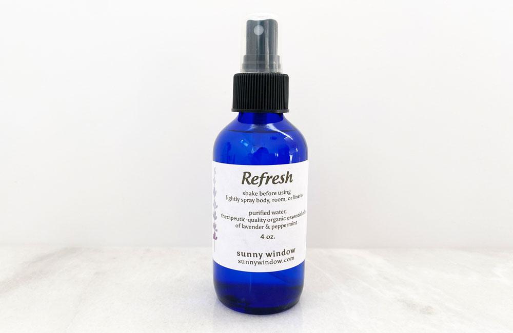 Peppermint and lavender essential oils work together to create a wonderful pick-me-up. Keep at your desk, in the car or in the kitchen. Really enhances your mood. Great for body, rooms and linens. Handcrafted in our Sunny Window studio with therapeutic quality essential oils and purified water. 4 oz.